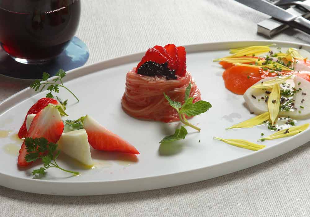 夕暮れには、山の稜線を眺めながら味わういちごの前菜を。