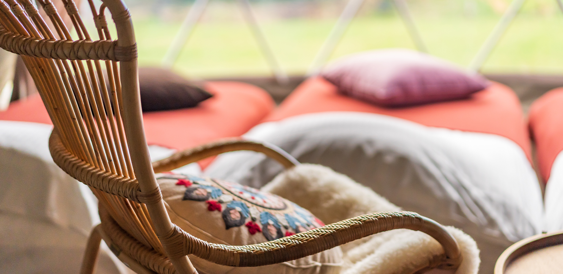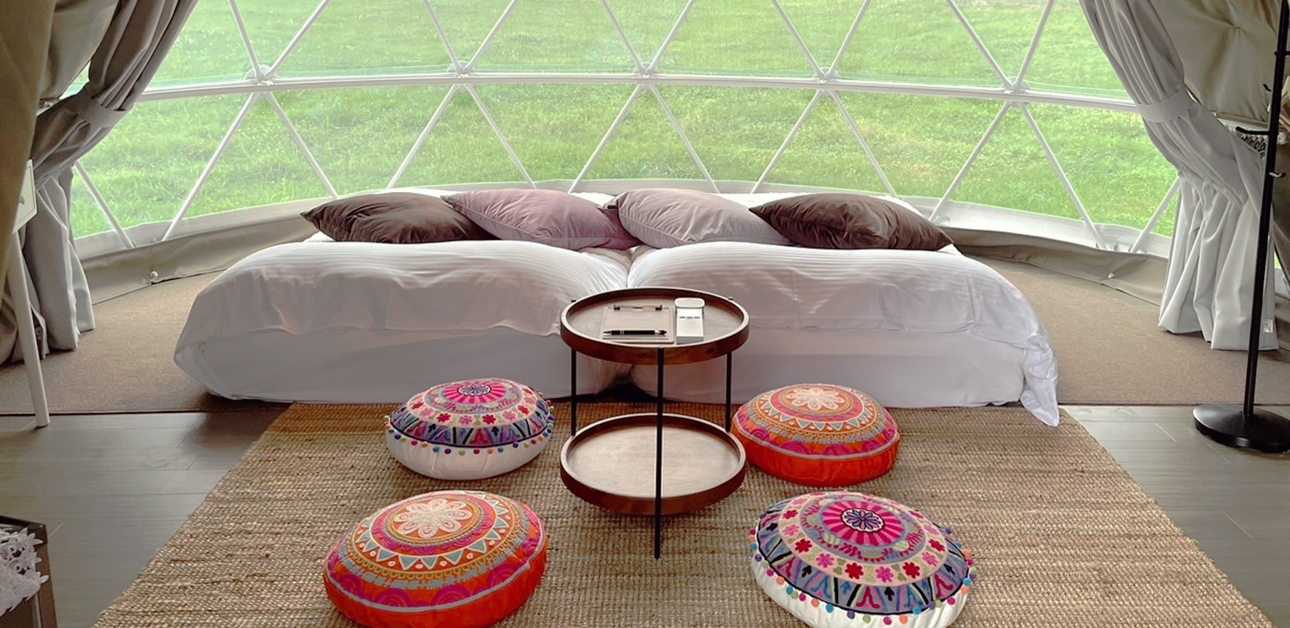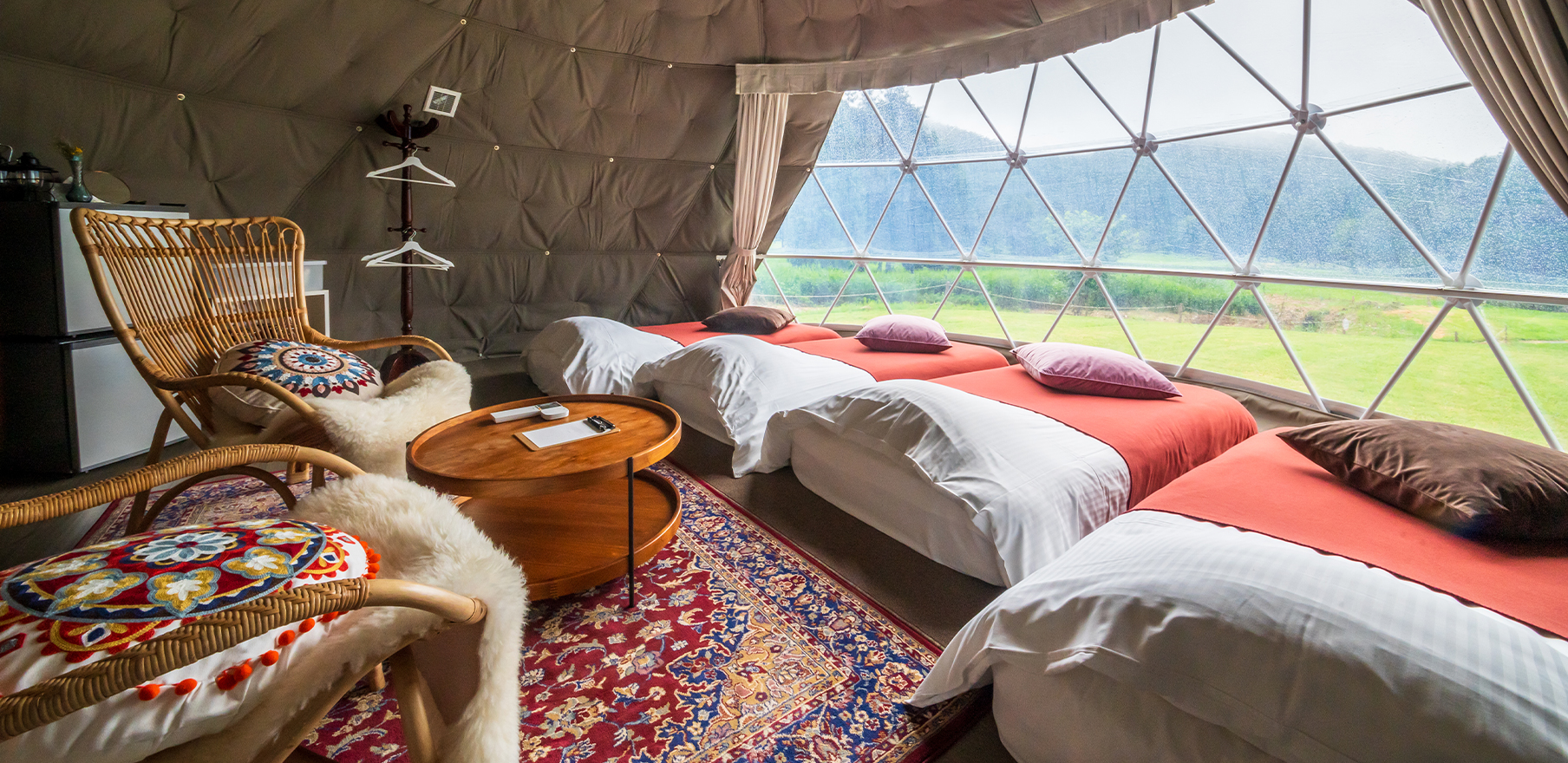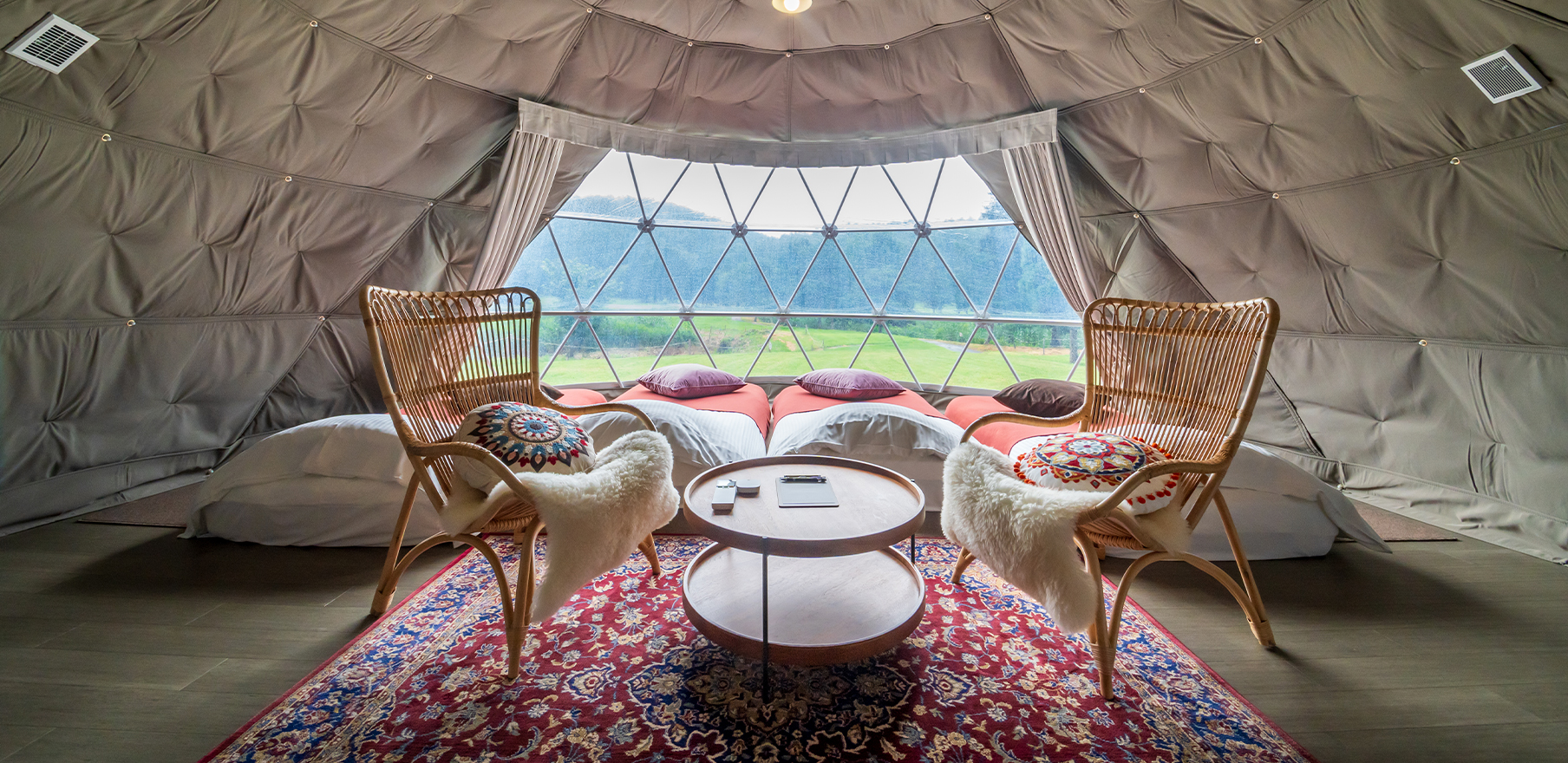 自然との一体感と上質な居心地を両立しているのは、リビングルームと寝室を分けて設計した、ツインドームテント。