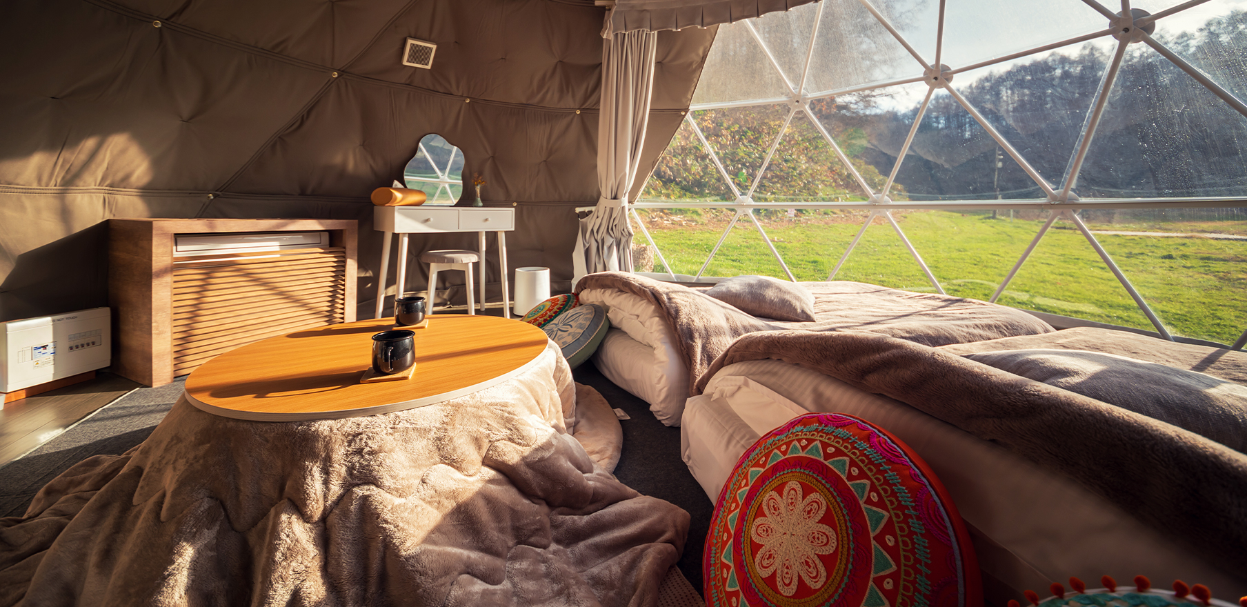 広々としたトリプルドームはアーツ&クラフトをテーマとした内装に。雄大な飯綱の山々を身近に感じてのんびりと過ごす優雅な休日。